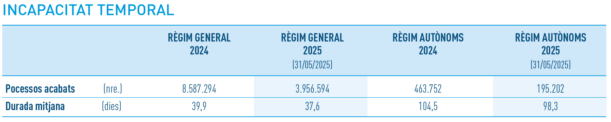 Els processos d’IT tenen una durada mitjana en el règim general propera als 40 dies (en el règim especial de treballadors autònoms supera els 100 dies), tot i que amb una gran variabilitat segons la patologia. Així, els trastorns musculoesquelètics o els problemes de salut mental solen allargar el temps de baixa, la qual cosa genera més costos i un impacte més acusat en les famílies i en la productivitat de les empreses.